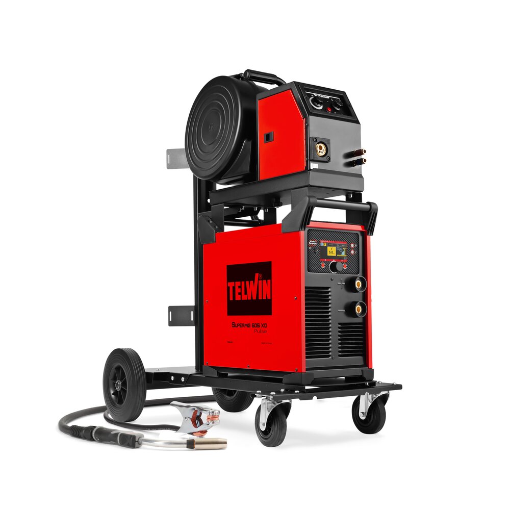 Completa di torcia MIG-MAG, cavo e pinza di massa, unità trainafilo, cavi di collegamento e carrello Federal.